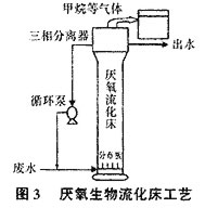 厭氧生物流化床可視為特殊的氣體進口速度為零的三相流化床。這是因為厭氧反應(yīng)過程分為水解酸化、產(chǎn)酸和產(chǎn)甲烷3個階段,床內(nèi)雖無需通氧或空氣,但產(chǎn)甲烷菌產(chǎn)生的氣體與床內(nèi)液、固兩相混和即成三相流化狀態(tài)。厭氧生物流化床工藝如圖3所示。為維持較高的上流速度,需采用較大的回流比。厭氧生物流化床內(nèi)微生物種群的分布趨于均一化,在床中央?yún)^(qū)域生物膜的產(chǎn)酸活性和產(chǎn)甲烷活性都很高,從而使其有效負荷大大提高。